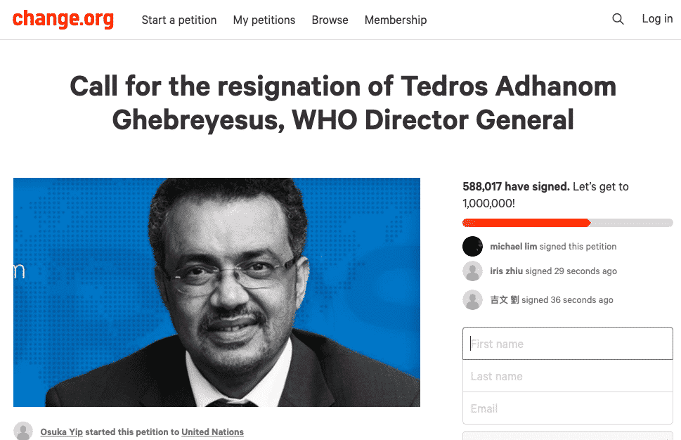 Đến nay, hơn 580.000 người đã ký tên trực tuyến trên change.org yêu cầu Tổng Giám đốc Tổ chức Y tế Thế giới (WHO) Tedros Adhanom Ghebreyesus từ chức vì đã đánh giá thấp nguy cơ bùng phát của dịch bệnh.