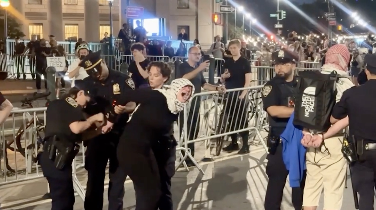 Một phóng viên của tờ New York Post đã chứng kiến cảnh một phụ nữ đeo khăn rằn đen trắng Keffiyeh bị một số cảnh sát NYPD vật mạnh xuống đất, dường như đầu của cô đã đập vào các rào chắn bị đổ.