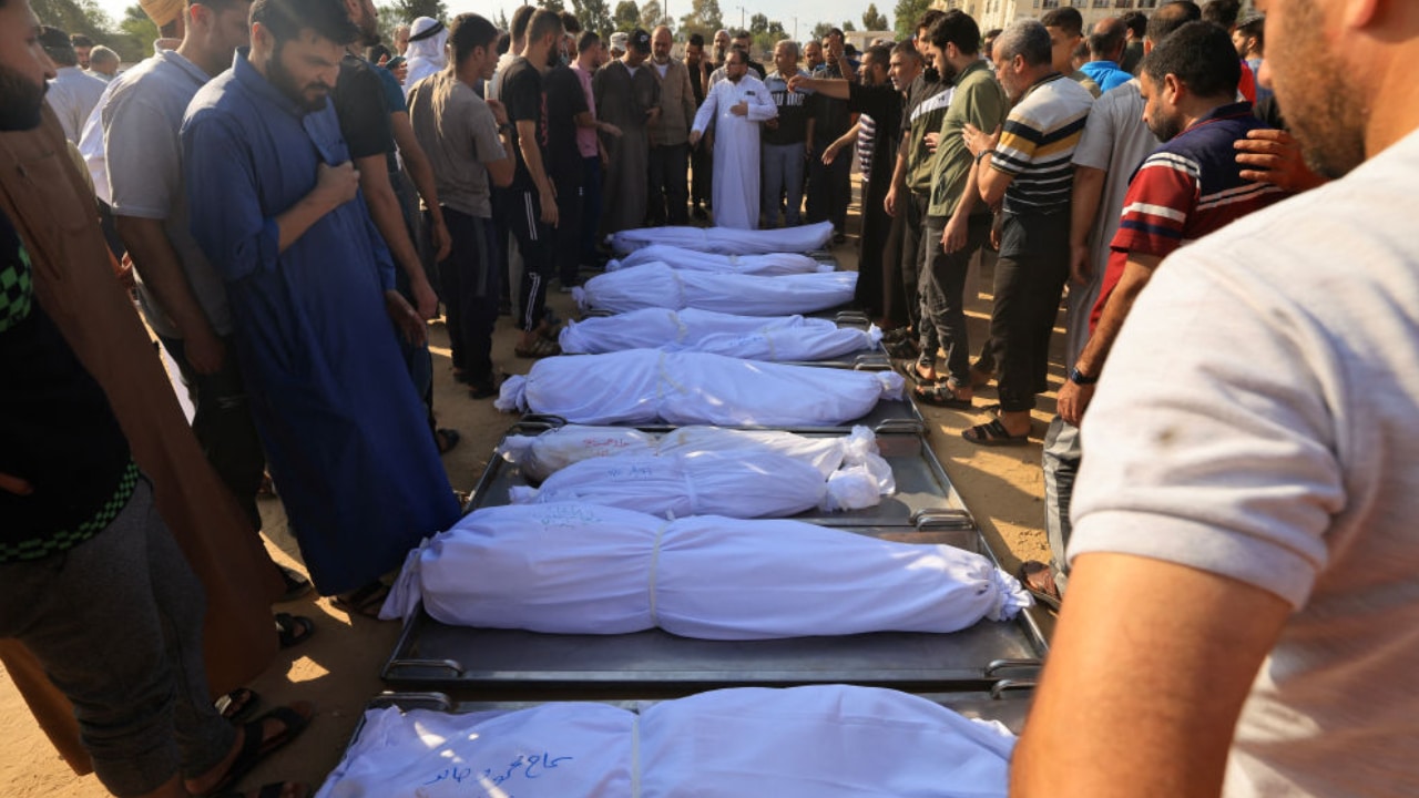 Những người đưa tang tập trung xung quanh thi thể được che phủ của các thành viên trong gia đình Agha, thiệt mạng trong cuộc tấn công của Israel vào Khan Yunis Dải Gaza. (Ảnh: MAHMUD HAMS/AFP qua Getty Images)
