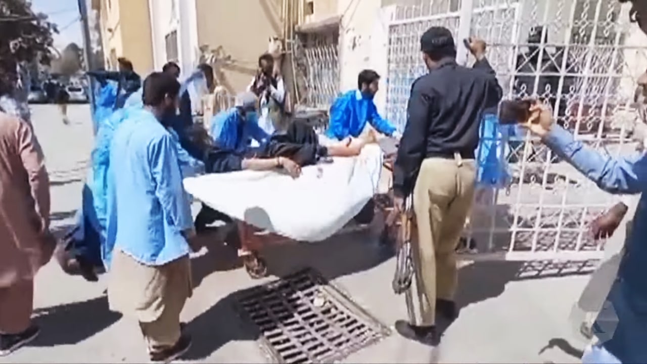 Ngày 29/9/2023, một kẻ đánh bom liều chết đã tấn công một cuộc tuần hành kỷ niệm ngày sinh của Nhà tiên tri Hồi giáo Muhammad ở khu vực Mastung. Các tình nguyện viên đang vận chuyển nạn nhân vụ nổ trên cáng tại bệnh viện ở Quetta. (Ảnh: Chụp màn hình video)