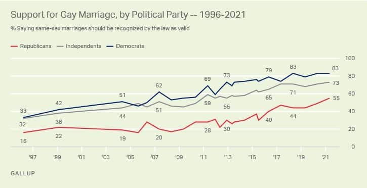 Thành viên Đảng Dân chủ là nhóm ủng hộ hôn nhân đồng tính nhiều nhất. Cuộc khảo sát mới nhất của Gallup cho thấy có tới 83% thành viên Đảng Dân chủ bày tỏ ủng hộ hôn nhân đồng tính hợp pháp. Trong khi đó, số người ủng hộ trong nhóm độc lập chính trị là 73%, tăng nhẹ từ 68% năm 2017 và 71% năm 2020.