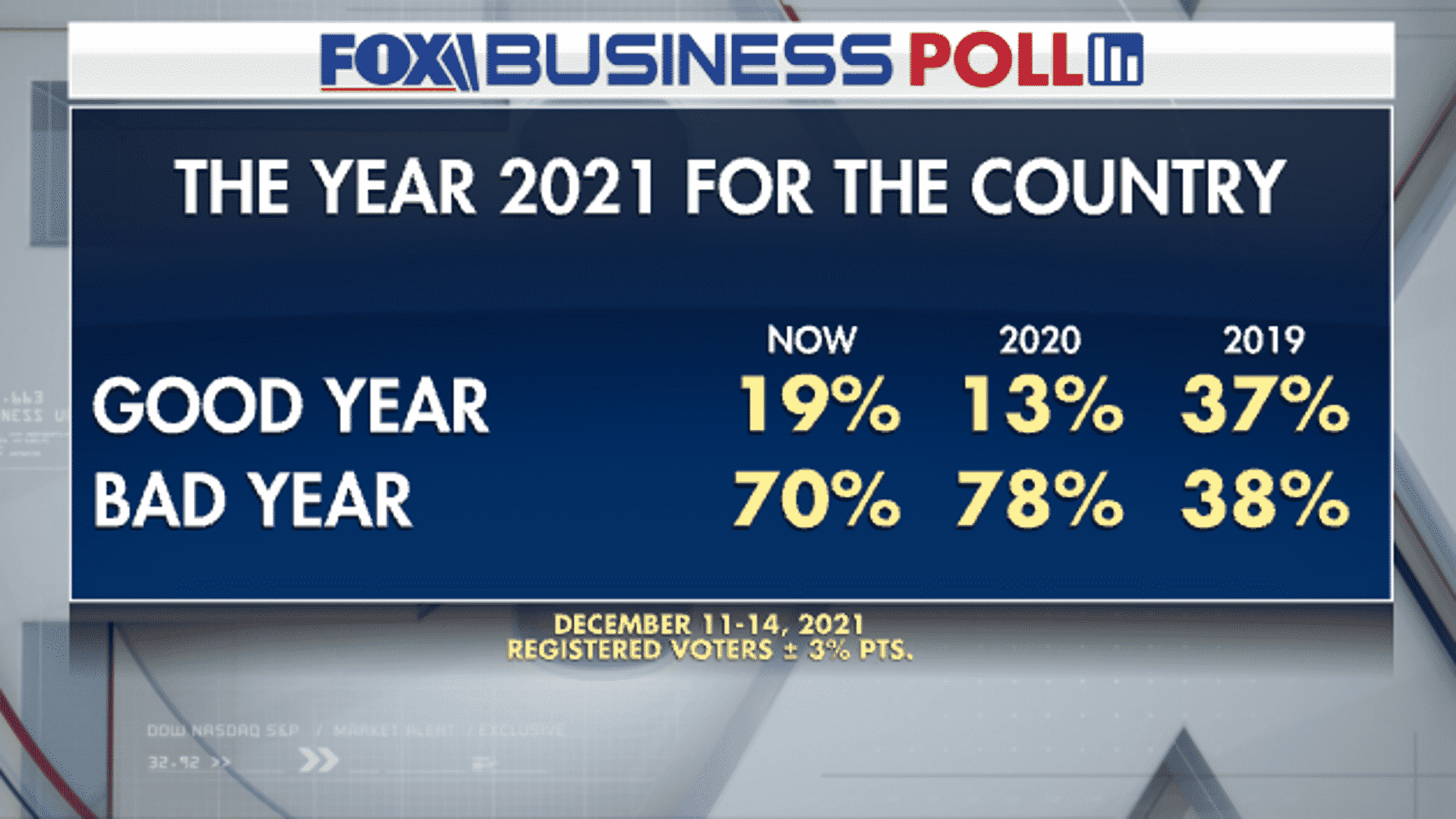 Kết quả khảo sát cho thấy 70% nói 2021 là năm tồi tệ đối với nước Mỹ. Tuy đó là con số tốt hơn so với 78% cử tri cảm thấy năm 2020 là tồi tệ, nhưng nó vẫn rất cao so với chỉ 38% cử tri nói năm 2019 là tồi tệ với nước Mỹ.