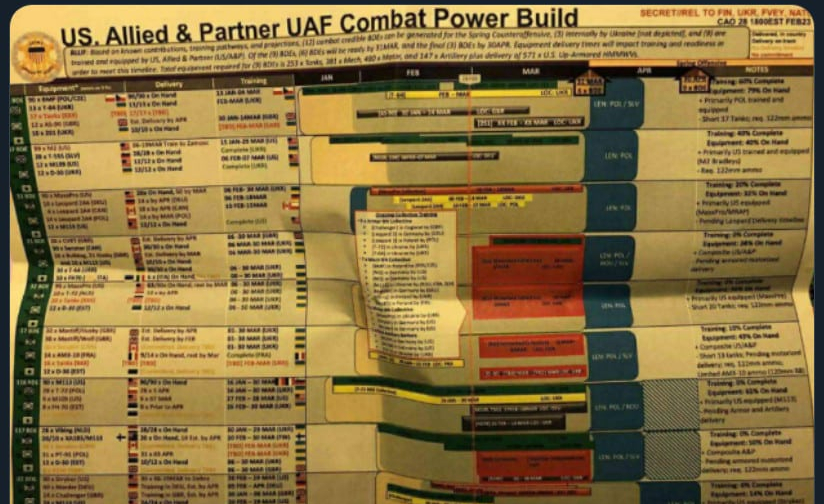 Một tài liệu khác bao gồm các cột liệt kê các đơn vị quân đội Ukraine, thiết bị và huấn luyện, với lịch trình từ tháng Giêng đến tháng Tư. Tài liệu chứa một bản tóm tắt về 12 lữ đoàn chiến đấu đang được tập hợp, trong đó có 9 lữ đoàn dường như được huấn luyện và cung cấp bởi Hoa Kỳ và các đồng minh NATO khác. Trong số 9 lữ đoàn đó, các tài liệu nói rằng 6 sẽ sẵn sàng vào ngày 31/3 và phần còn lại vào ngày 30/4. Một lữ đoàn Ukraine có khoảng 4.000 đến 5.000 binh sĩ, các nhà phân tích nhận định.