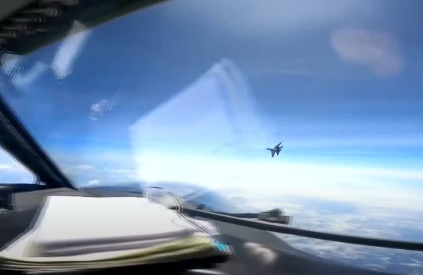 Một đoạn video do Bộ Quốc phòng Mỹ công bố cho thấy, chiến đấu cơ J-16 tạt ngang trước mũi máy bay của Hoa Kỳ, và buồng lái chiếc RC-135 rung chuyển trong vùng nhiễu động.