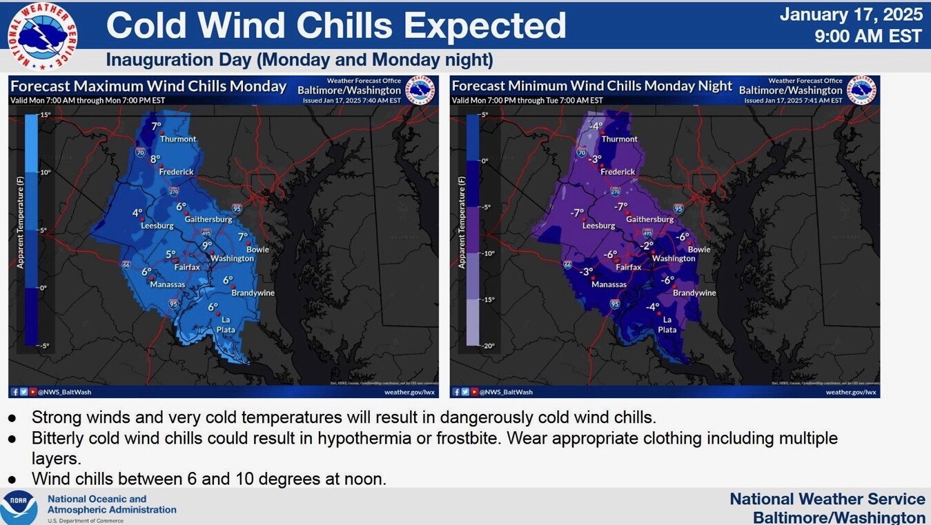 Ông Trump đã trích dẫn “cơn gió Bắc Cực” đang quét qua Hoa Kỳ và dự báo thời tiết vào thứ Hai (20/1) tại Washington cho biết “nhiệt độ thấp kỷ lục nghiêm trọng” với gió lạnh, để lập luận rằng điều này sẽ tạo ra điều kiện nguy hiểm cho “hàng trăm nghìn người ủng hộ sẽ ở bên ngoài trong nhiều giờ“, cũng như cảnh sát và chó nghiệp vụ và ngựa của họ.
