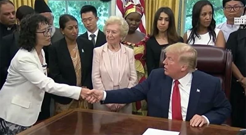 Ba ngày trước tuyên bố của CECC (ngày 17/7), Tổng thống Mỹ Trump vừa gặp học viên Pháp Luân Công Trương Ngọc Hoa (Zhang Yuhua) tại Nhà Trắng, bà là một trong 27 người may mắn sống sót trong chiến dịch đàn áp tôn giáo mà hôm đó Tổng thống Trump gặp mặt. Khi gặp mặt, Tổng thống Trump đã hỏi bà Trương Ngọc Hoa rằng, chồng bà bị giam tại nhà tù nào? Bà Trương Ngọc Hoa trả lời rằng ở nhà tù Tô Châu tỉnh Giang Tô. Ngoài ra, bà còn chia sẻ với Trump về việc ĐCSTQ cưỡng bức lấy nội tạng của các học viên Pháp Luân Công vẫn đang diễn ra, bà yêu cầu chính quyền Trump giúp đỡ ngăn chặn chiến dịch đàn áp này của ĐCSTQ. Trump liên tục trả lời tán đồng rằng: “Tôi hiểu.”