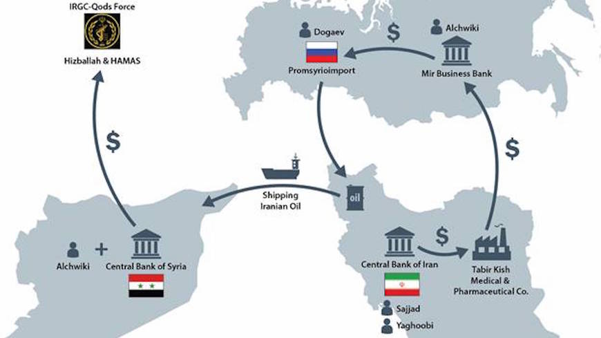 Bộ Tài chính Mỹ xác định ông Mohammad Amer Alchwiki, quốc tịch Syria là nhân vật trung tâm của kế hoạch tuồn dầu mỏ từ Iran sang Syria vi phạm chế tài của Mỹ. Ông Alchwiki đã sử dụng công ty Global Vision Group có trụ sở tại Nga của ông để vận chuyển dầu Iran tới Syria và tạo thuận lợi cho việc chuyển tiền cho các lực lượng ủy nhiệm của Iran tại Syria, trong đó có các nhóm khủng bố hồi giáo cực đoan Hezbollah và Hamas. Chế tài này của Mỹ cũng nhắm vào hai quan chức làm việc cho ngân hàng trung ương Iran, cũng như một công ty vận tải của Nga và phó giám đốc của công ty này.