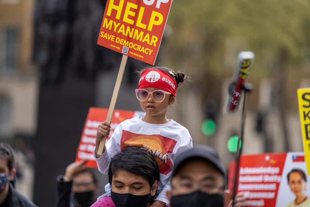 Biểu tình phản đối cuộc đảo chính ở Myanmar (Ảnh: stocksre / Shutterstock)