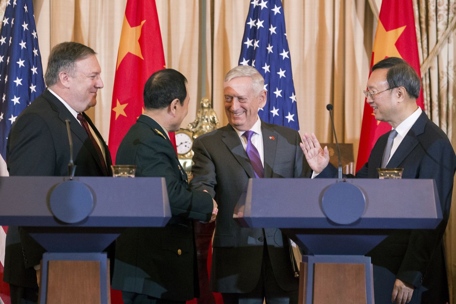 Theo Reuters, tham dự vòng Đối thoại Ngoại giao và An ninh Mỹ – Trung lần này phía Trung Quốc có Ủy viên Bộ chính trị Dương Khiết Trì và Bộ trưởng Quốc phòng Ngụy Phượng Hòa. Tiếp đón và hội đàm với phái đoàn Trung Quốc là hai Bộ trưởng Ngoại giao và Quốc phòng Mỹ Mike Pompeo và James Mattis.