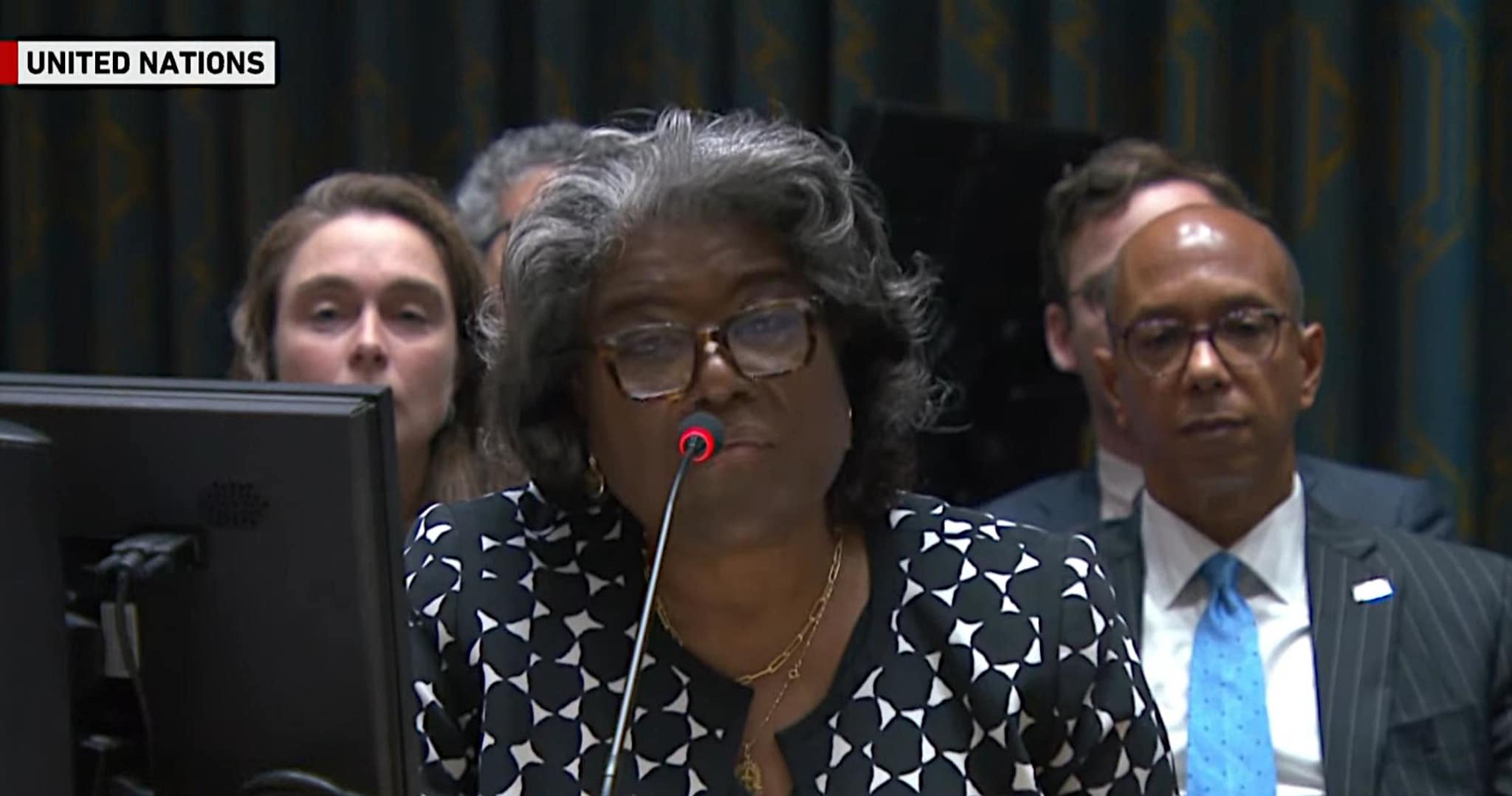 Bà Thomas-Greenfield, Đại sứ Mỹ tại LHQ, giải thích cho lá phiếu phủ quyết của Mỹ rằng Mỹ thất vọng vì dự thảo nghị quyết không đề cập đến quyền tự vệ của Israel, và bà đổ lỗi cho Hamas về cuộc khủng hoảng nhân đạo ở Gaza.