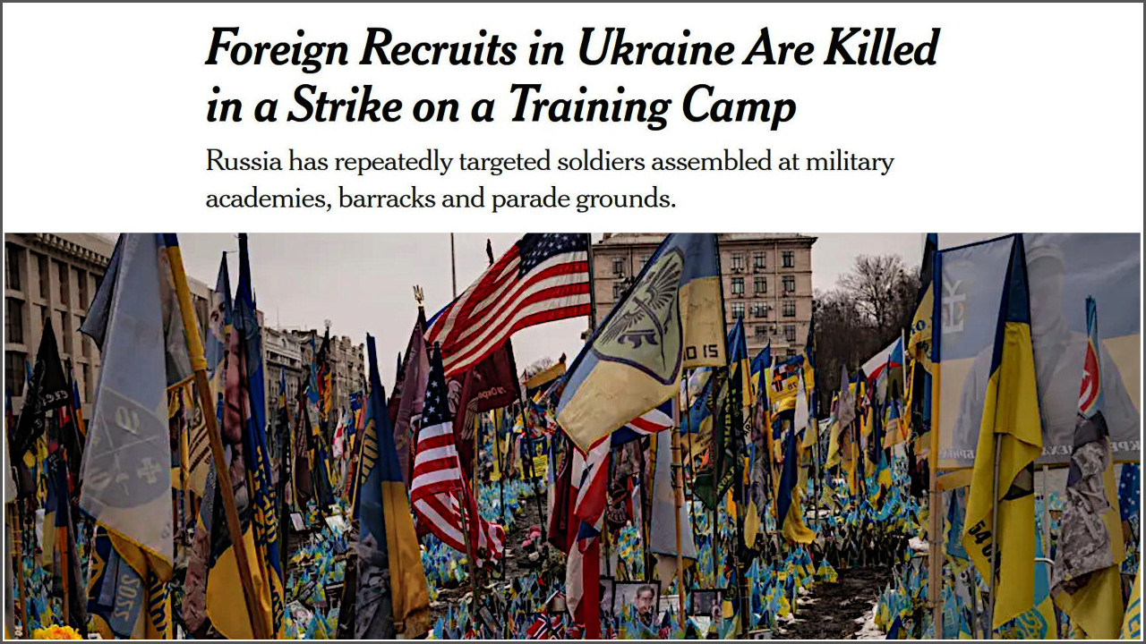 Truyền thông Mỹ vừa loan tin, tên lửa Nga hôm 21/7 đã đánh trúng nơi huấn luyện tân binh khi lính nước ngoài đang dùng bữa trưa. Một tân binh từ Florida kể với tờ báo rằng đây là tiếng nổ lớn nhất mà anh từng chứng kiến, và anh thấy ít nhất 15 lính ngoại quốc mất mạng và trên 100 lính ngoại quốc bị thương. Anh kể rằng mọi người đều bị bất ngờ, khi không hề có còi cảnh báo. Anh chứng kiến tận mắt cảnh máu thịt văng tung tóe và tình trạng thiếu thiết bị sơ cứu. Cư dân mạng Ukraine than thở rằng họ chỉ biết được việc này tận 20 ngày sau khi nó xảy ra, mà là nhờ một tờ báo ngoại quốc.