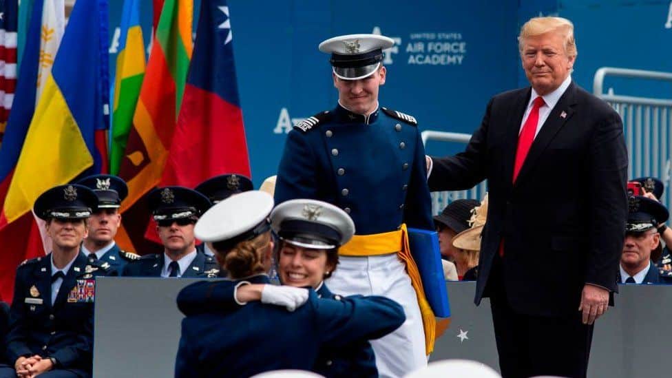 Tổng thống Trump có mặt trong lễ tốt nghiệp học viện không quân Mỹ, phía sau là lá cờ Đài Loan cùng nhiều cờ nước khác.