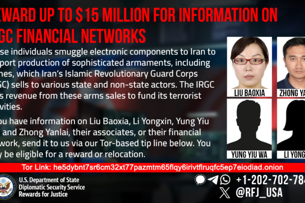 Chương trình Phần thưởng vì Công lý (RFJ) của Bộ Ngoại giao Hoa Kỳ đang trao phần thưởng lên tới 15 triệu USD cho thông tin liên quan đến các cơ chế tài chính của Lực lượng Vệ binh Cách mạng Hồi giáo Iran (IRGC) và các chi nhánh của lực lượng này, bao gồm cả IRGC-QF.