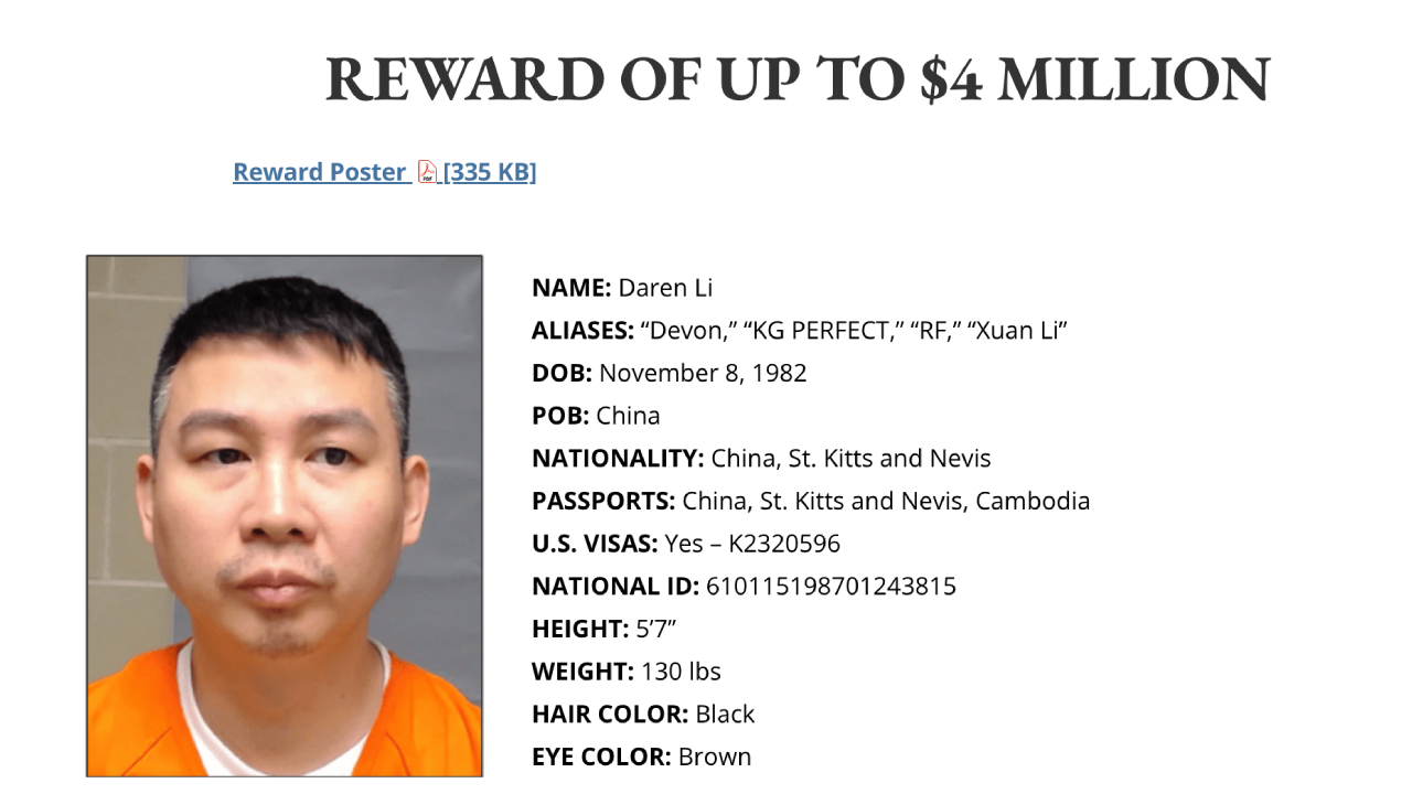 Cơ quan thực thi pháp luật liên bang Hoa Kỳ hôm 23/4 thông báo phát lệnh treo thưởng lên tới 4 triệu USD cho bất kỳ thông tin nào giúp bắt giữ đối tượng bỏ trốn Daren Li (Lý Đạt Luân). Trước đó, người này từng bị Mỹ bắt giữ nhưng sau khi nhận tội tại tòa đã trốn thoát.