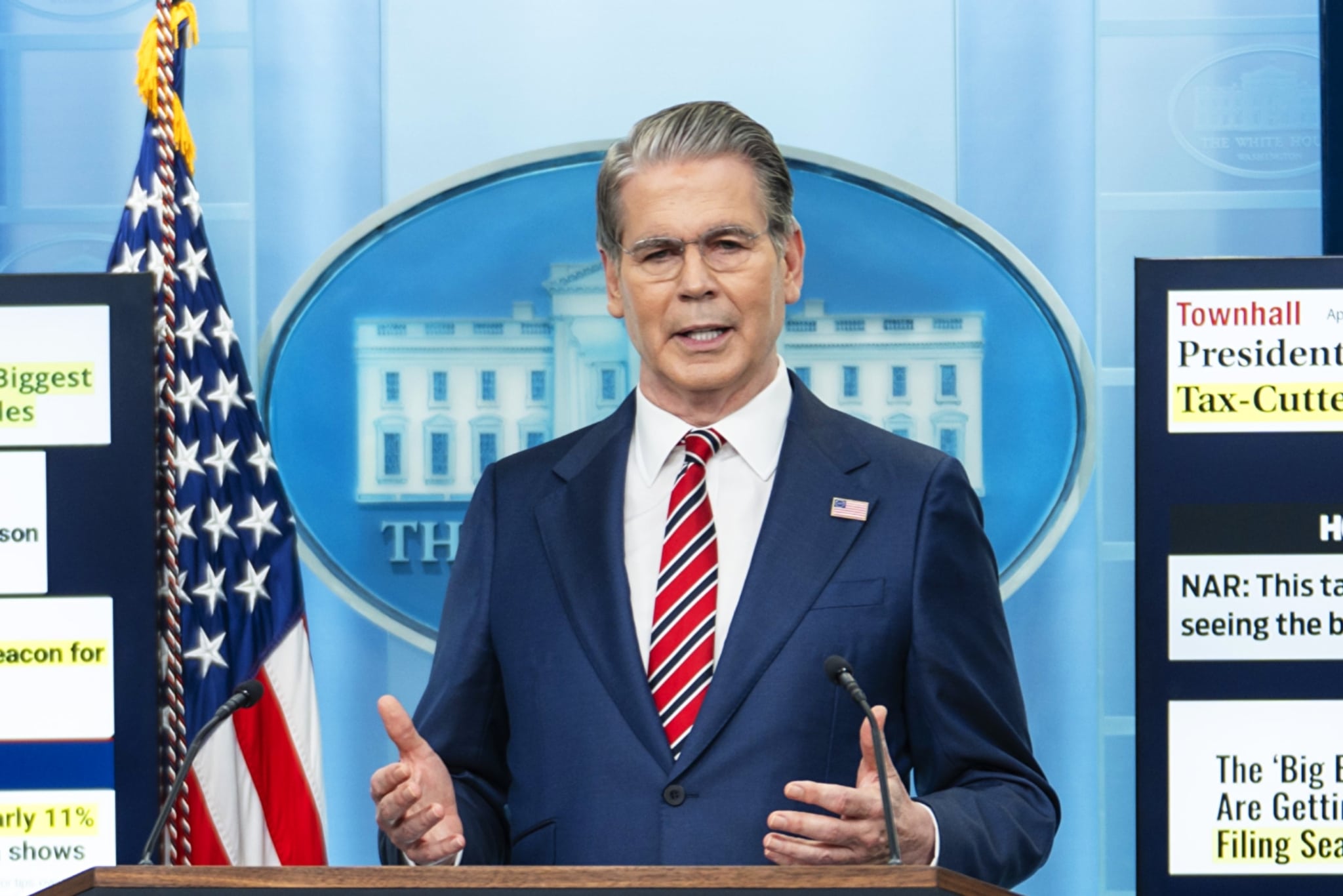 Ảnh chụp Bộ trưởng Tài chính Mỹ Scott Bessent phát biểu tại một cuộc họp báo ở Phòng họp báo Brady tại Nhà Trắng vào ngày 15 /4/2026. (Nguồn ảnh: Madalina Kilroy/Epoch Times)