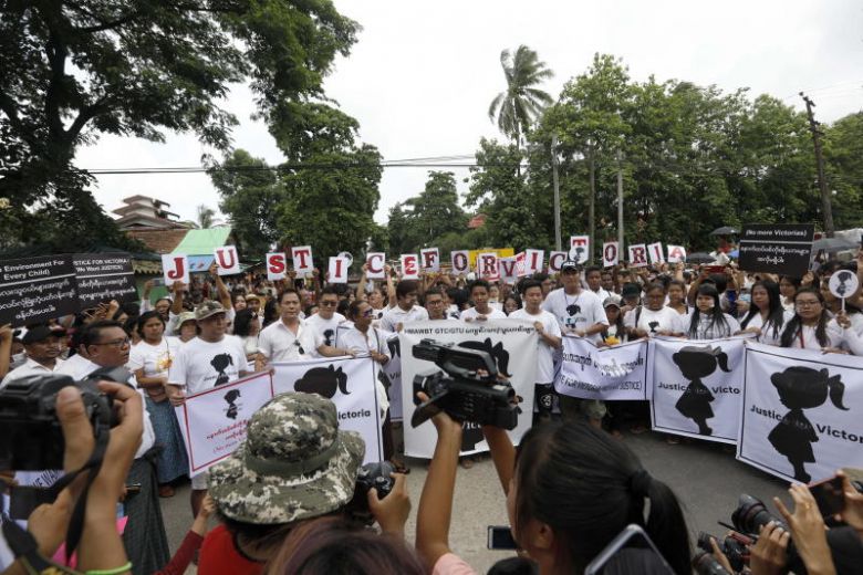 Những người tổ chức biểu tình ước tính hôm thứ Bảy (6/7) có khoảng 6.000 người tập trung tại Văn phòng Sở Điều tra Hình sự Yangon (CID). Người biểu tình mặc áo phông trắng, một số có in dòng chữ “Công lý cho Victoria” và họ cầm theo biểu ngữ ghi: “Chúng tôi không muốn có thêm nhiều trường hợp như Victoria”.