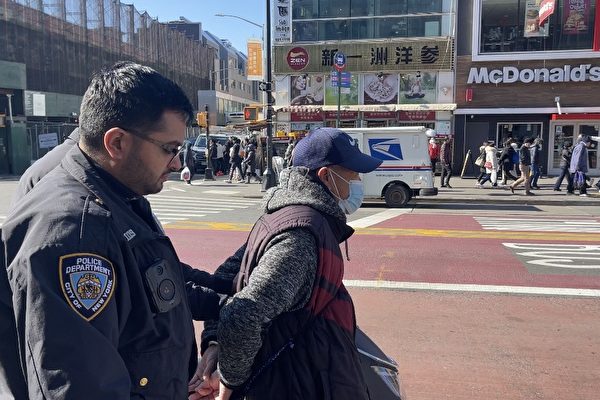 Ngày 18/2/2023, Tề Trung Bình (Qi, Zhongping), kẻ đã tấn công các học viên Pháp Luân Công, lại xuất hiện trên đường phố Flushing. Ông ta lập tức bị cảnh sát bắt giữ, còng tay và đưa lên xe. (Ảnh: Trung tâm Giới thiệu Pháp Luân Công cung cấp)