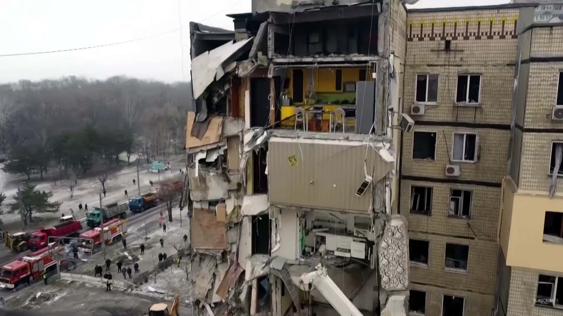 Hai phe Nga và Ukraine đổ lỗi nhau về vụ đánh sập một phần tòa nhà chung cư ở thành phố Dnipro hồi tháng 1/2023. Vụ hàng chục thường dân thiệt mạng này đã đẩy nhanh tiến độ đưa xe tăng phương Tây vào chiến trường Ukraine. (Ảnh cắt từ video)