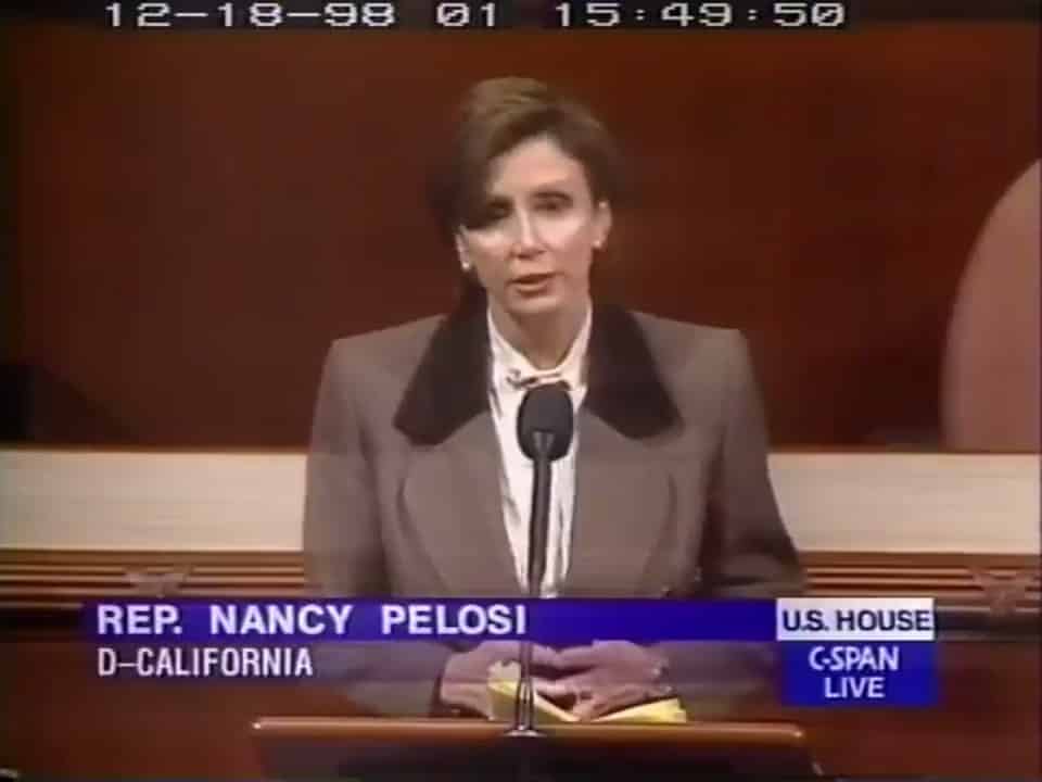Bà Nancy Pelosi làm việc tại Quốc hội Mỹ từ năm 1987 và trong phiên họp của Hạ viện Mỹ tháng 12/1998, với cương vị là Lãnh đạo phe thiểu số Hạ viện, Dân biểu Pelosi nói rằng: “Hôm nay đa số Cộng hòa đã không phán xét tổng thống [Clinton] công bằng, mà lại luận tội ông ta với [thái độ] báo thù.”