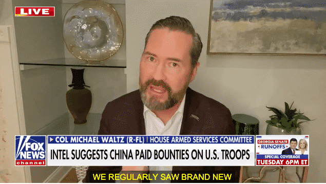 Trong chương trình “Fox & Friends” hôm 1/1 của kênh Fox News, Hạ nghị sĩ đảng Cộng hòa Michael Waltz (bang Florida) đã phản ứng trước thông tin tình báo được giải mật gần đây về việc Trung Quốc chi tiền thưởng cho việc tấn công binh lính Mỹ ở Afghanistan.