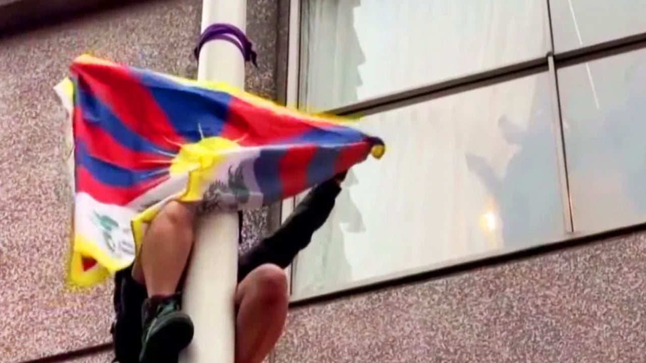 Lúc này, một cảnh tượng gây sốc đã xảy ra. Bên ngoài khách sạn, một phụ nữ trẻ người Tây Tạng đã khéo léo trèo lên cột đèn, dùng dải vải trói mình vào cột đèn, rồi giương cờ Tây Tạng. Một số kênh truyền thông xã hội cho biết, tên cô ấy là Tselha.