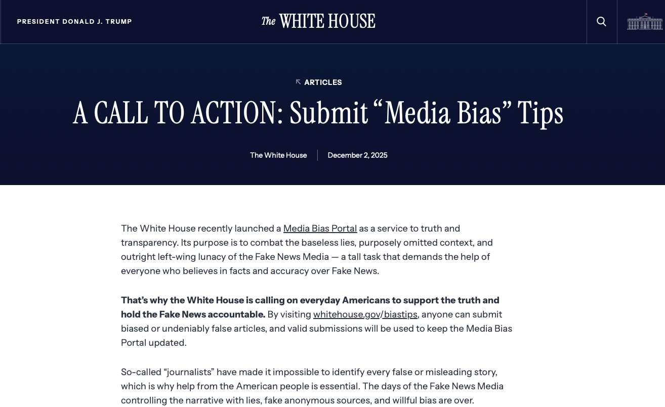 Chính quyền của Tổng thống Donald Trump đã lập một cổng thông tin chính thức của Nhà Trắng nhằm liệt kê các hãng truyền thông bị cáo buộc đưa tin sai lệch hoặc thiên lệch, trong đó có danh sách những hãng truyền thông “vi phạm nhiều lần”. Cổng thông tin này nêu đích danh nhiều cơ quan báo chí lớn, gắn nhãn lỗi và cho phép công chúng gửi phản ánh về các bài viết bị cho là không chính xác. Động thái này làm dấy lên tranh cãi gay gắt, khi giới báo chí và các tổ chức bảo vệ tự do ngôn luận cho rằng đây là biện pháp gây áp lực chính trị và có nguy cơ xói mòn tự do báo chí.