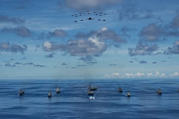 Ngày 25/9/2020, tổ hợp mới của biên đội tàu sân bay Mỹ, với sự phối hợp của máy bay ném bom chiến lược B-1B và tiêm kích F-22 Raptor, đã xuất hiện ở khu vực biển Philippines. (Ảnh: Mass Communication Specialist 2nd Class Codie Soule / Hải quân Mỹ).
