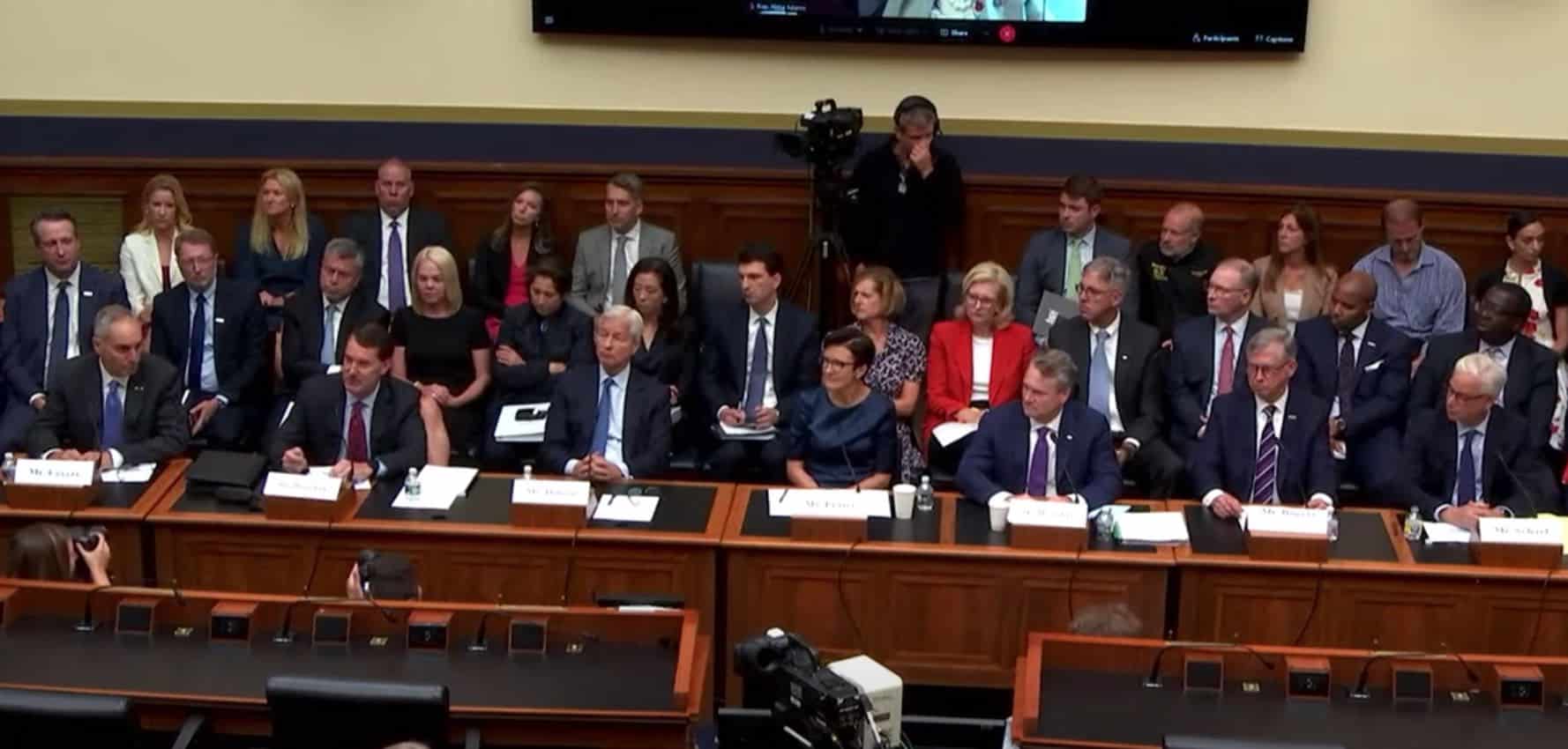 Ngày 21/9 CEO của 8 ngân hàng Mỹ, bao gồm Bank of America, Citibank và JPMorgan Chase, đã điều trần trước Ủy ban Tài chính Hạ viện của Quốc hội Mỹ. (Ảnh chụp màn hình video).