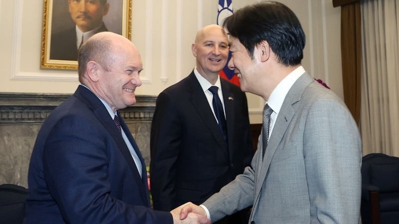 Chủ tịch Tiểu ban Châu Á - Thái Bình Dương thuộc Ủy ban Đối ngoại Thượng viện Hoa Kỳ, ông Pete Ricketts (giữa, phía sau), dẫn đầu phái đoàn nghị sĩ lưỡng đảng đến thăm Đài Loan. Tổng thống Lại Thanh Đức (bên phải) tiếp đón phái đoàn tại Phủ Tổng thống vào ngày 18/4. Các thành viên trong đoàn bao gồm cả nghị sĩ Dân chủ Chris Coons (bên trái), người giữ chức thành viên cao cấp của tiểu ban. (Nguồn ảnh: Guo Rixiao / CNA)