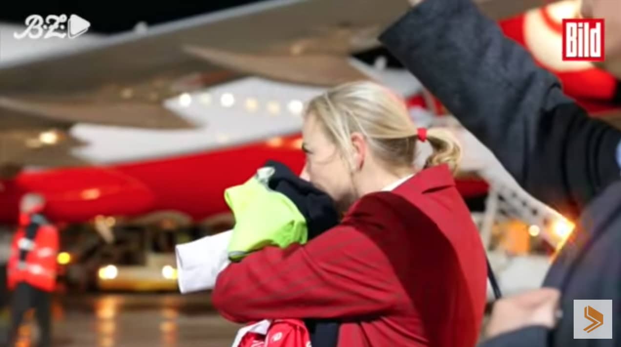 Ngày 27/10, chuyến bay cuối cùng của Berlin Airlines đã hạ cánh tại Berlin, có hơn 1600 người chờ đợi tại sân bay Tegel ở Berlin, nhiều người trong số đó là nhân viên của Air Berlin (Ảnh chụp màn hình Youtube).