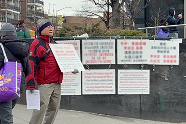 Tháng 2/2025, tại Flushing, một người tập Pháp Luân Công nhiều lần chất vấn một người đàn ông Trung Quốc (mặc áo khoác màu be) đang giơ bảng và phát tờ rơi. Tấm bảng đó cũng lặp lại các luận điểm từ nhiều bài báo sai sự thật của tờ New York Times nhằm vào Pháp Luân Công và Shen Yun.