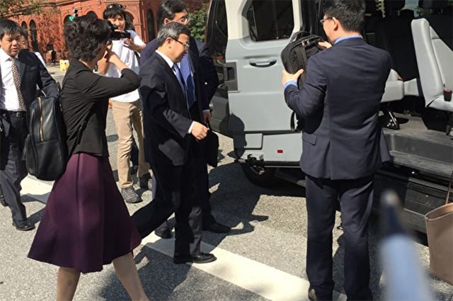 Hình ảnh đoàn đàm phán của Trung Quốc rời khỏi trụ sở của Bộ Tài chính Mỹ, Thứ trưởng Bộ thương mại Trung Quốc (giữa ảnh) đang bước lên xe (Ảnh: Getty Images)