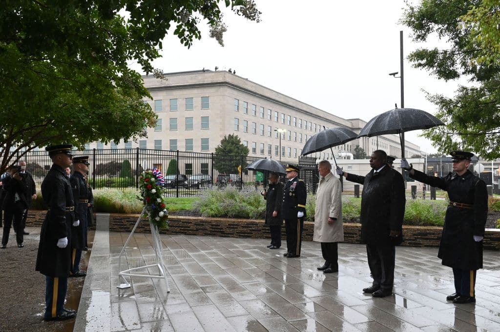 Bộ trưởng Quốc phòng Lloyd Austin chủ trì buổi lễ tại Đài tưởng niệm Lầu Năm Góc ngày 11/9 ở Arlington. Ông nói: “Ngày 11/9 đã khiến nước Mỹ rơi vào trạng thái quốc gia có chiến tranh, với hàng trăm ngàn người mặc quân trang đứng lên phục vụ đất nước chúng ta.”