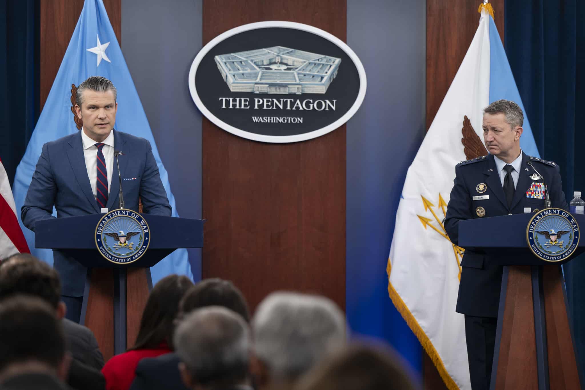 Vào thứ Sáu (13/3), chiến dịch tác chiến chung của Hoa Kỳ và Israel chống lại Iran đã bước sang ngày thứ 14. Bộ trưởng Chiến tranh Mỹ Pete Hegseth và Chủ tịch Hội đồng Tham mưu trưởng Liên quân John D. Caine đã tổ chức họp báo tại Lầu Năm Góc để giới thiệu tình hình chiến sự.Bộ trưởng Chiến tranh Pete Hegseth và Chủ tịch Hội đồng Tham mưu trưởng Liên quân, Tướng Không quân Hoa Kỳ Dan Caine, tại cuộc họp báo về Chiến dịch “Cơn thịnh nộ sử thi” (Epic Fury) tại Lầu Năm Góc, Washington, D.C., ngày 2/3/2026. (Ảnh của Bộ Chiến tranh Mỹ do Trung sĩ Không quân Hoa Kỳ Madelyn Keech chụp / Flickr)