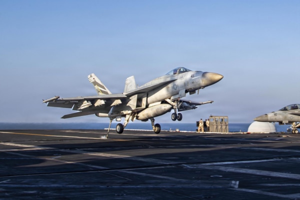 An F/A-18E Super Hornet, attached to Strike Fighter Squadron (VFA) 151, makes an arrested landing on the flight deck of Nimitz-class aircraft carrier USS Abraham Lincoln (CVN 72) in support of Vào ngày 3 tháng 3 năm 2026, một chiếc F/A-18E Super Hornet thuộc Phi đội tiêm kích tấn công số 151 (VFA-151) của Hải quân Hoa Kỳ đã hạ cánh xuống tàu sân bay USS Abraham Lincoln (CVN 72) trong Chiến dịch Epic Fury. (Hải quân Hoa Kỳ)