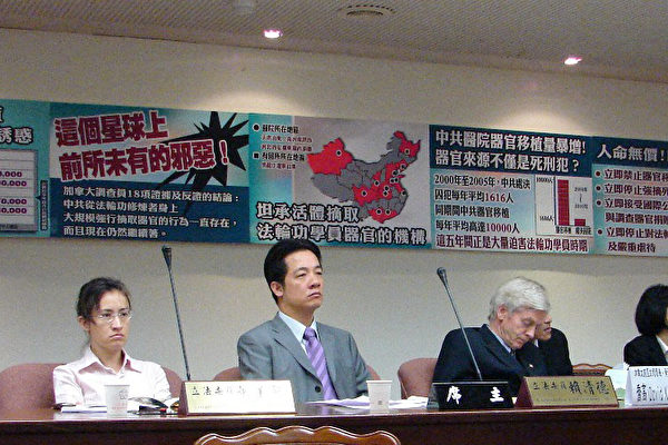 Theo một báo cáo của Epoch Times vào thời điểm đó, khi những hành vi tà ác của ĐCSTQ trong việc cưỡng bức thu hoạch và buôn bán nội tạng từ các học viên Pháp Luân Công bị phơi bày, các nhà lập pháp Đài Loan lúc bấy giờ là ông Lại Thanh Đức và bà Tiêu Mỹ Cầm đã tổ chức một phiên điều trần công khai tại Viện Lập pháp, với chủ đề “Đến Trung Quốc Đại Lục để ghép tạng: Cứu mạng? Hiến mạng? Hay lấy mạng? Quyền của bệnh nhân ghép tạng tại Đài Loan.”