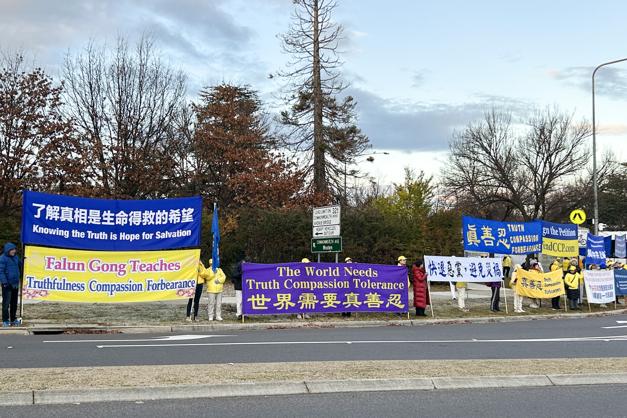 Người tu Pháp Luân Công tại hiện trường phản đối cuộc đàn áp tàn bạo của ĐCSTQ suốt 25 năm qua, và kêu gọi chấm dứt ngay việc giết hại những người tu Pháp Luân Công ở Trung Quốc Đại Lục. Nội dung của các biểu ngữ bao gồm: “Chấm dứt cuộc bức hại Pháp Luân Công”, “Pháp Luân Đại Pháp hảo”, “Thế giới cần Chân, Thiện, Nhẫn”, v.v.