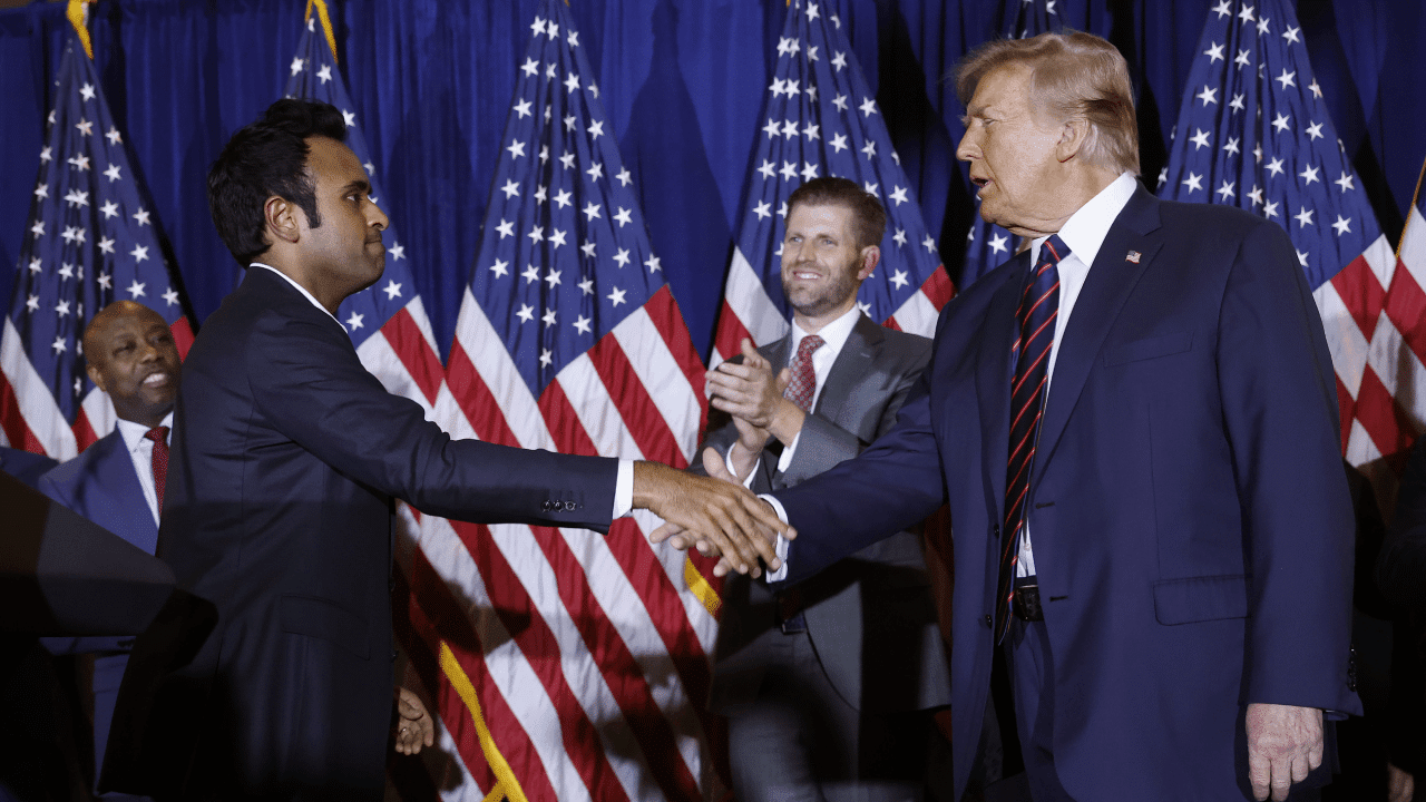 Cựu Tổng thống Hoa Kỳ Donald Trump bắt tay cựu ứng cử viên tổng thống Đảng Cộng hòa Vivek Ramaswamy trong bữa tiệc đêm sơ bộ tại Sheraton vào ngày 23 tháng 1 năm 2024 ở Nashua, New Hampshire. (Ảnh: Chip Somodevilla/Getty Images)