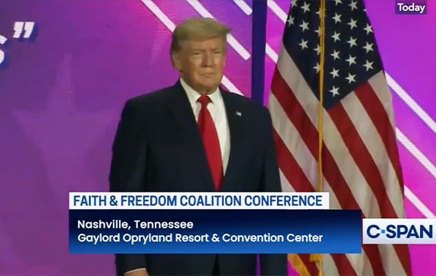 Ngày 17/6, ông Trump đã phát biểu tại "Hội nghị liên minh Tín ngưỡng và Tự do: Đường đến Đa số" (Faith and Freedom Coalition:Road to Majority Conference) ở Nashville, tiểu bang Tennessee. (Ảnh: Chụp màn hình video C-Span)