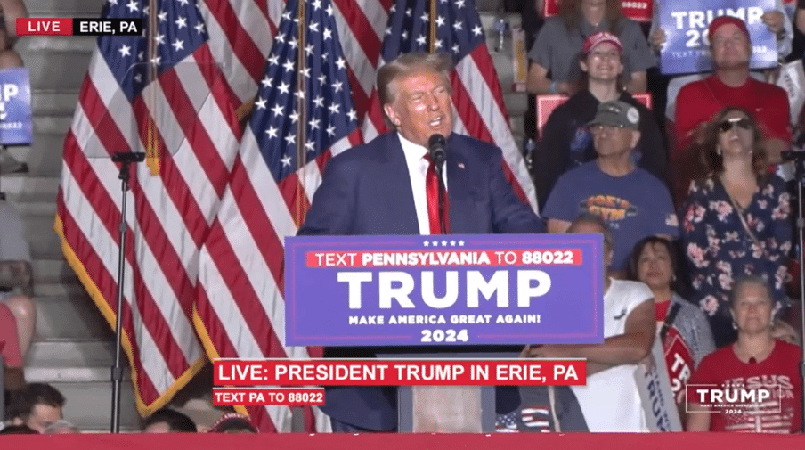 Cựu Tổng thống Trump phát biểu trước gần 10.000 người ủng hộ tại Erie, Pennsylvania hôm 29/7/2023. (Ảnh chụp màn hình video)