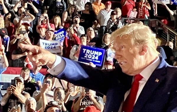 Cựu Tổng thống Donald Trump chỉ tay về phía khán giả trong cuộc tập trung vận động chiến dịch tổng thống 2024 tại Erie, Pennsylvania hôm 29/7/2023. (Ảnh: Janice Hisle/The Epoch Times)