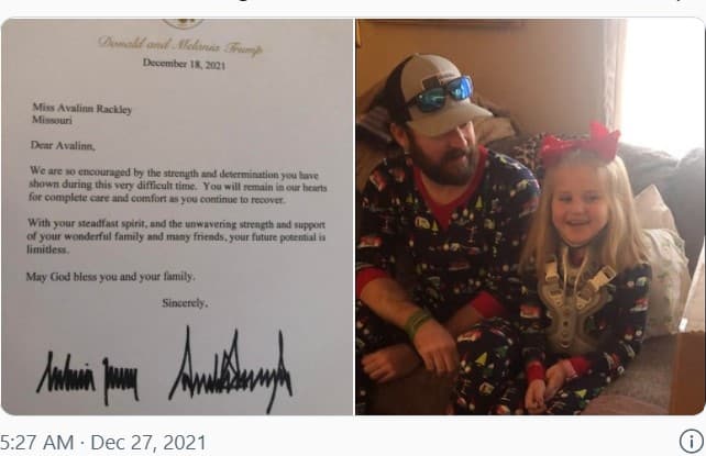 Cựu Tổng thống Donald Trump và phu nhân Melania đã gửi những hộp quà Giáng sinh đến Avalinn Rackley, một bé gái 7 tuổi bị thương nặng do trận lốc xoáy kinh hoàng tại Missouri hồi đầu tháng này. Trận lốc xoáy cũng đã khiến chị gái Annistyn 9 tuổi của Avalinn thiệt mạng.