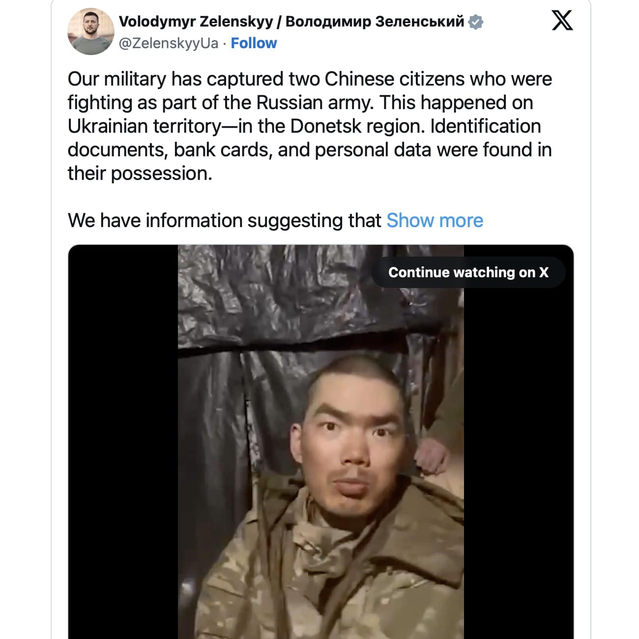 Tổng thống Ukraine Zelensky đăng trên mạng xã hội X tuyên bố Kiev đã bắt được hai binh lính Trung Quốc chiến đấu cho quân đội Nga.