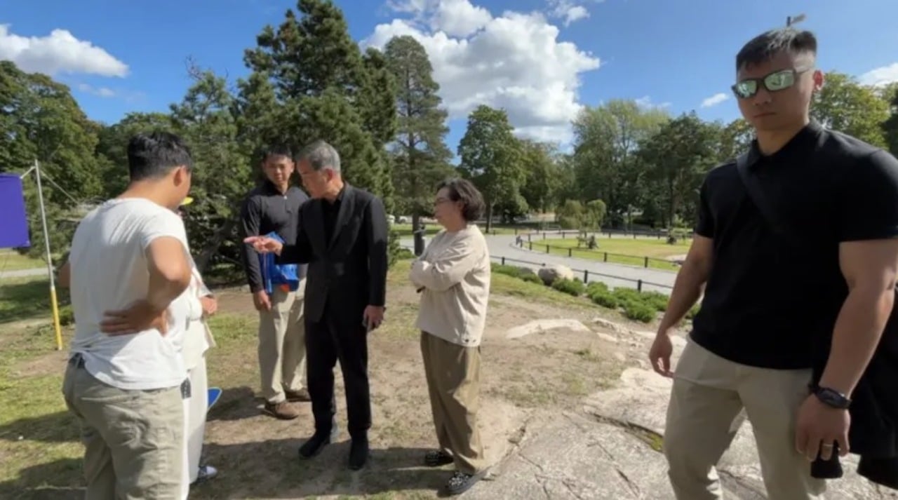 Ông Lương Chấn Anh (trái, giữa) và bà Đường Thanh Nghi (phải, giữa) cùng hai người đàn ông mặc áo đen, nghi là vệ sĩ, xuất hiện tại công viên ở Helsinki, Phần Lan và có hành vi đe dọa người tập Pháp Luân Công. (Nguồn ảnh: Faluninfo)