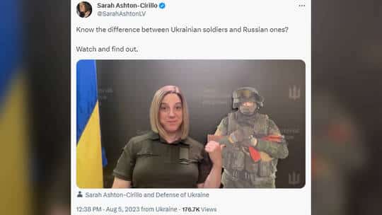 Cô Sarah Ashton-Cirillo hôm thứ Bảy (5/8) đã đăng lên mạng xã hội X (tên cũ là Twitter) đoạn video ngắn 21 giây, trong đó cô đứng trước một hình lính Nga được cắt vẽ bằng bìa cứng và chỉ tay vào nhân vật này đặt câu hỏi: “Quý vị có biết sự khác biệt giữa chúng ta và bọn họ không?”