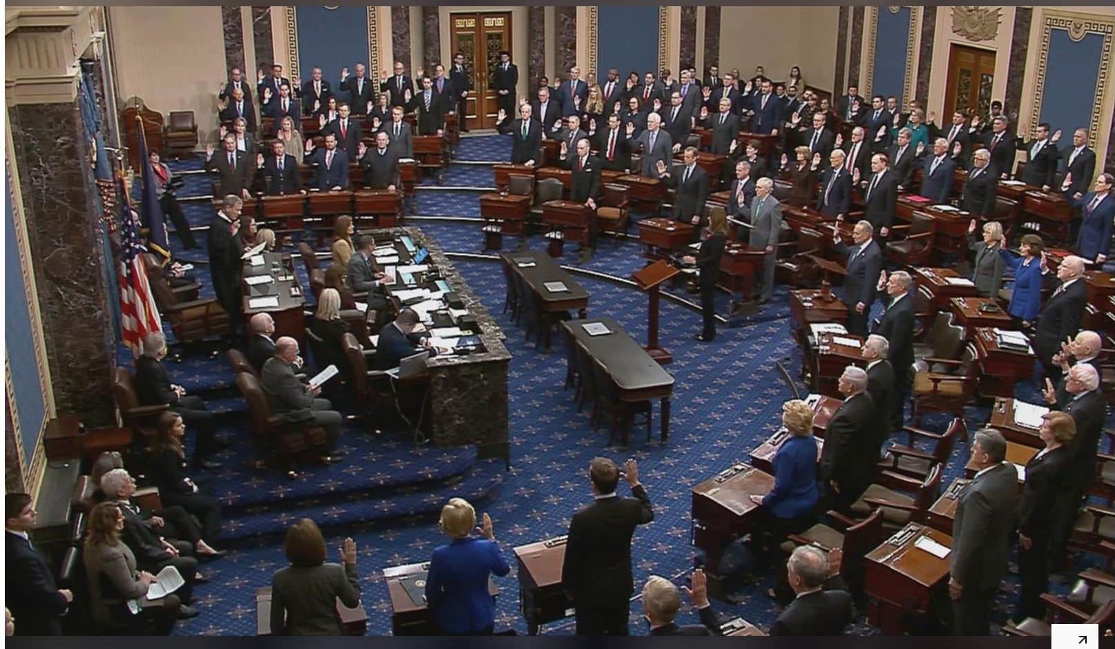 Chánh án Tòa án Tối cao John Roberts đã tuyên thệ làm thẩm phán của phiên tòa và giúp các Thượng Nghị sĩ có mặt trong phòng họp tuyên thệ để trở thành bồi thẩm đoàn công tâm không thiên vị.
