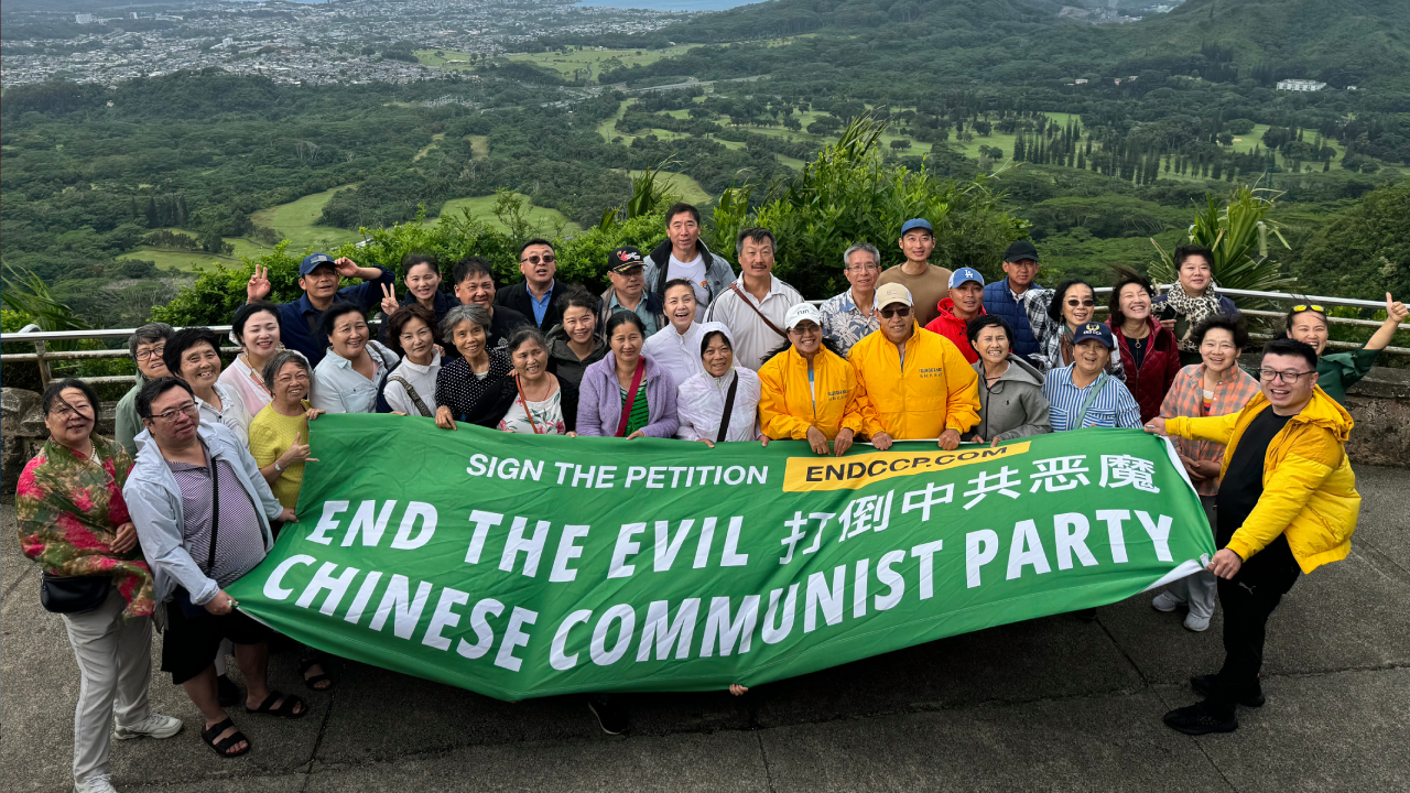 Đoàn xe “Đả đảo ác ma Trung Cộng” (End CCP) đã đến Hawaii, tiểu bang thứ 50 trong hành trình của họ, tại điểm ngắm cảnh nổi tiếng Nuuanu Pali và trưng bày khẩu hiệu “Đả đảo ác ma Trung Cộng” (End CCP). (Ảnh: Trung tâm thoái ĐCSTQ toàn cầu)