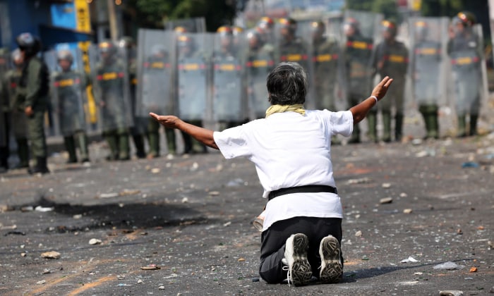 Một người tham gia đoàn áp tải hàng viện trợ quỳ gối trước các thành viên lực lượng Cảnh vệ Quốc gia trong vụ đụng độ dọc biên giới Urena, bang Tachira, Venezuela hôm thứ 23/2/2019. (Ảnh: Carlos Becerra/Bloomberg via Getty Images)
