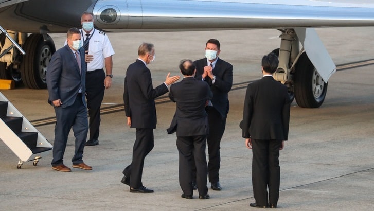 Sau khi xuống máy bay, Thứ trưởng Bộ Ngoại giao Mỹ Krach (người chắp tay) đã chào lễ những người tiếp đón như Giám đốc Viện Mỹ tại Đài Loan Brent Christensen (người quay lưng đối diện ở phía trái), và Thứ trưởng Chính vụ Bộ Ngoại giao Đài Loan Tseng Hou-jen (người quay lưng đối diện ở phía phải).