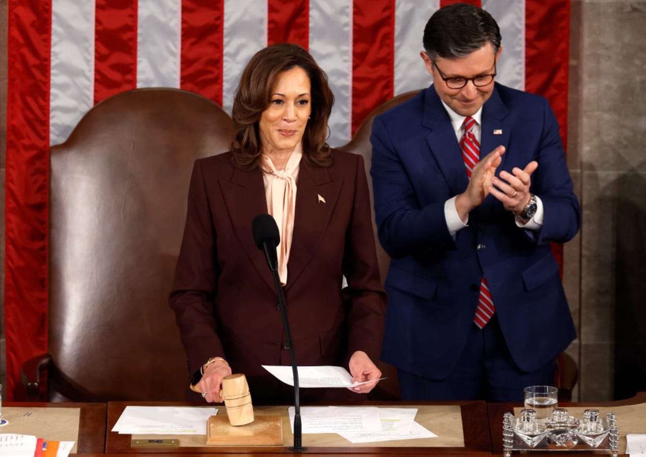 Phó Tổng thống Kamala Harris chủ trì tiến trình chứng nhận phiếu bầu của Đại cử tri đoàn trong phiên họp chung của Quốc hội Hoa Kỳ để phê chuẩn cuộc bầu cử Tổng thống năm 2024 tại Điện Capitol Hoa Kỳ vào ngày 06 tháng 01 năm 2025 tại Washington, DC. (Ảnh: Chip Somodevilla/Getty Images)